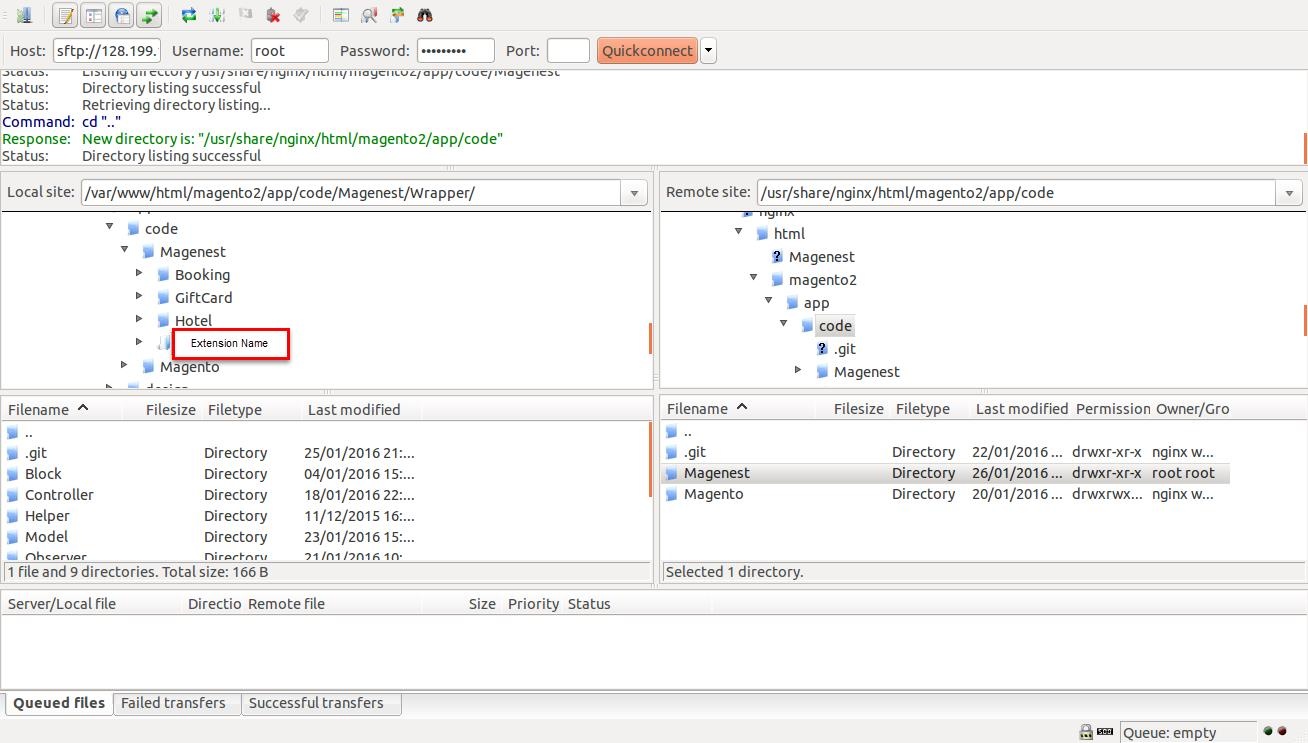 In the above example we switched the local site to the extension directory, and the remote site to the code directory. Now on the remote site window, inside app/code directory, create a folder named Magenest and go inside it. Now on your local site window, right click on Extension Name and click Upload. The extension will be uploaded onto your host in a few minutes.