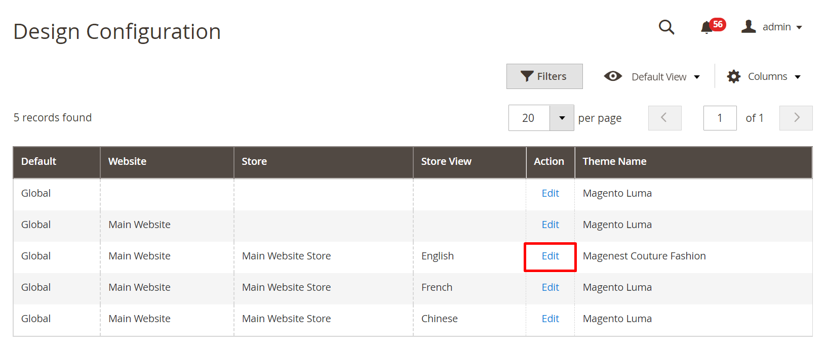 To enable the Couture Fashion theme, on the Admin sidebar, go to Content > Configuration > Edit.