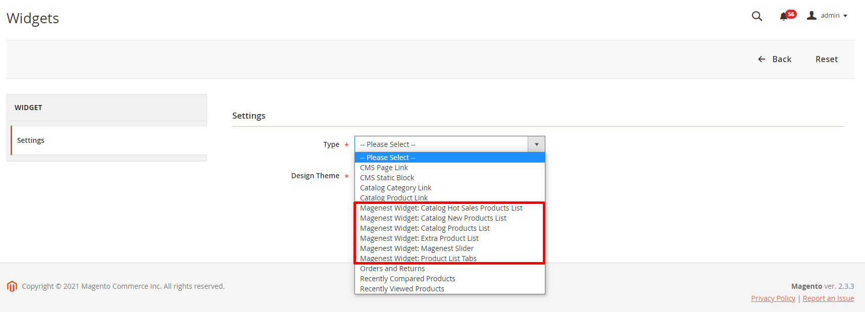 On the admin sidebar, go to Content > Widgets > Add widget.