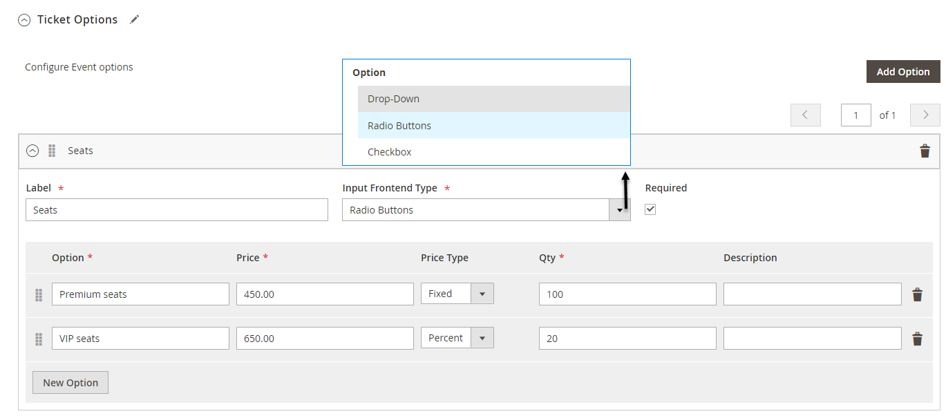 Percent: The option for VIP seat costs 10% more from the product price. The total price for the ticket will be $110. - Input front type: You can choose to display the ticket options from 3 types (Drop-down, radio buttons, checkbox).