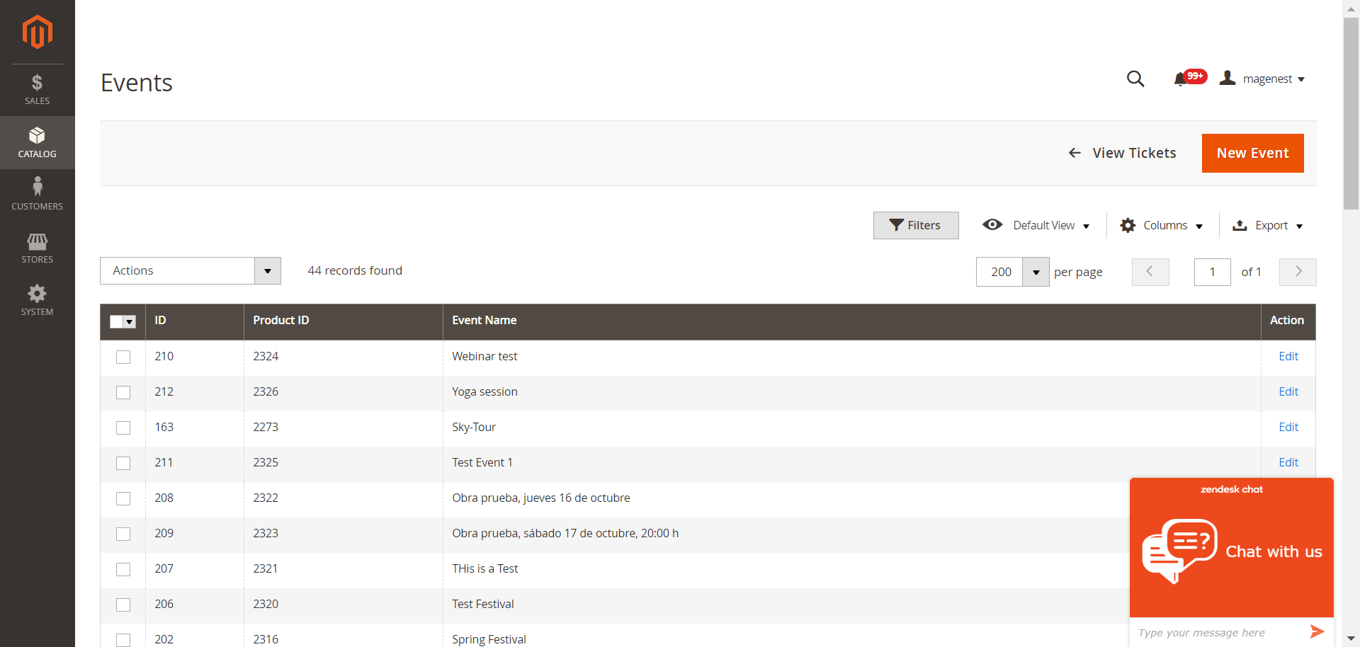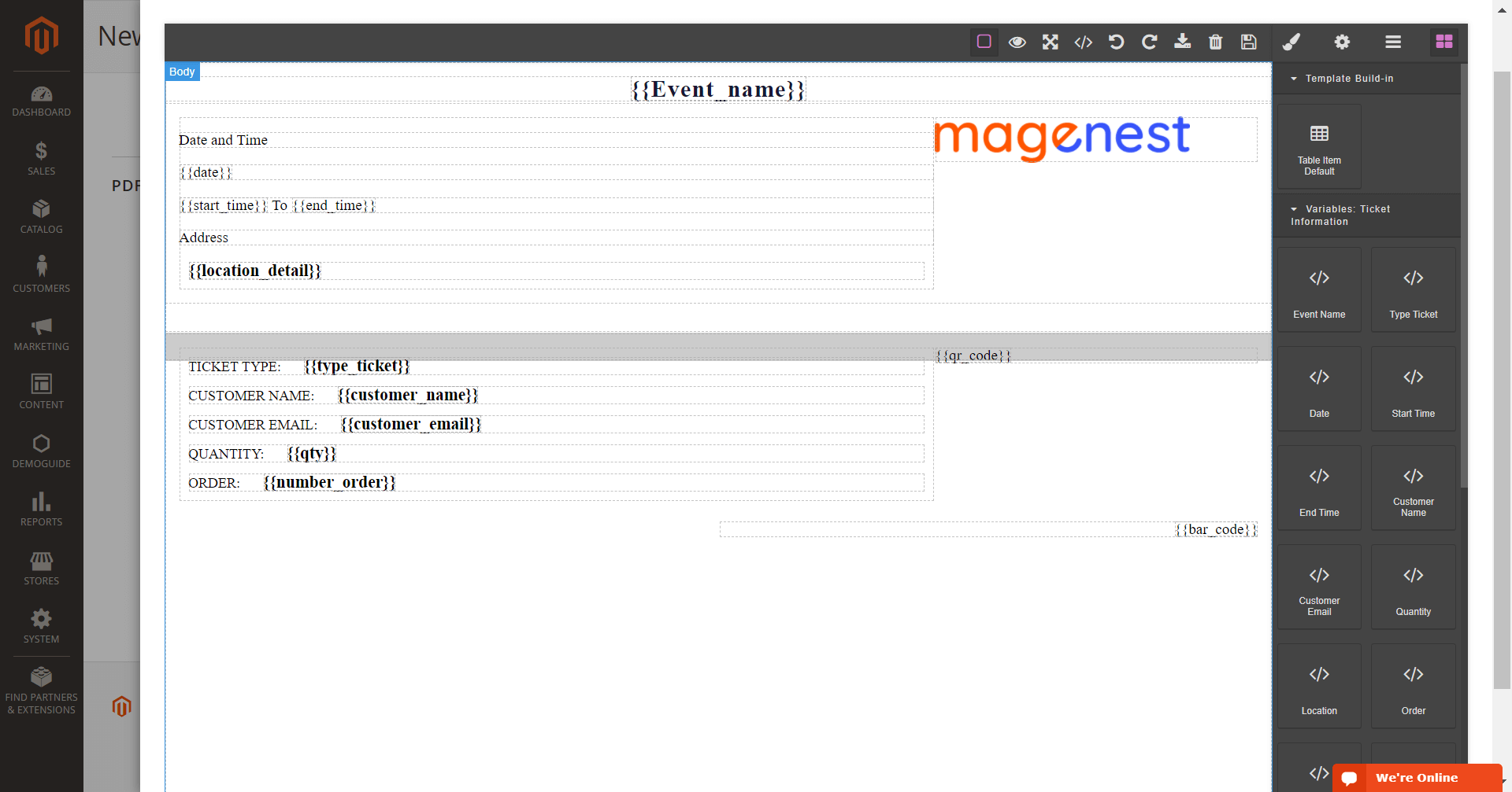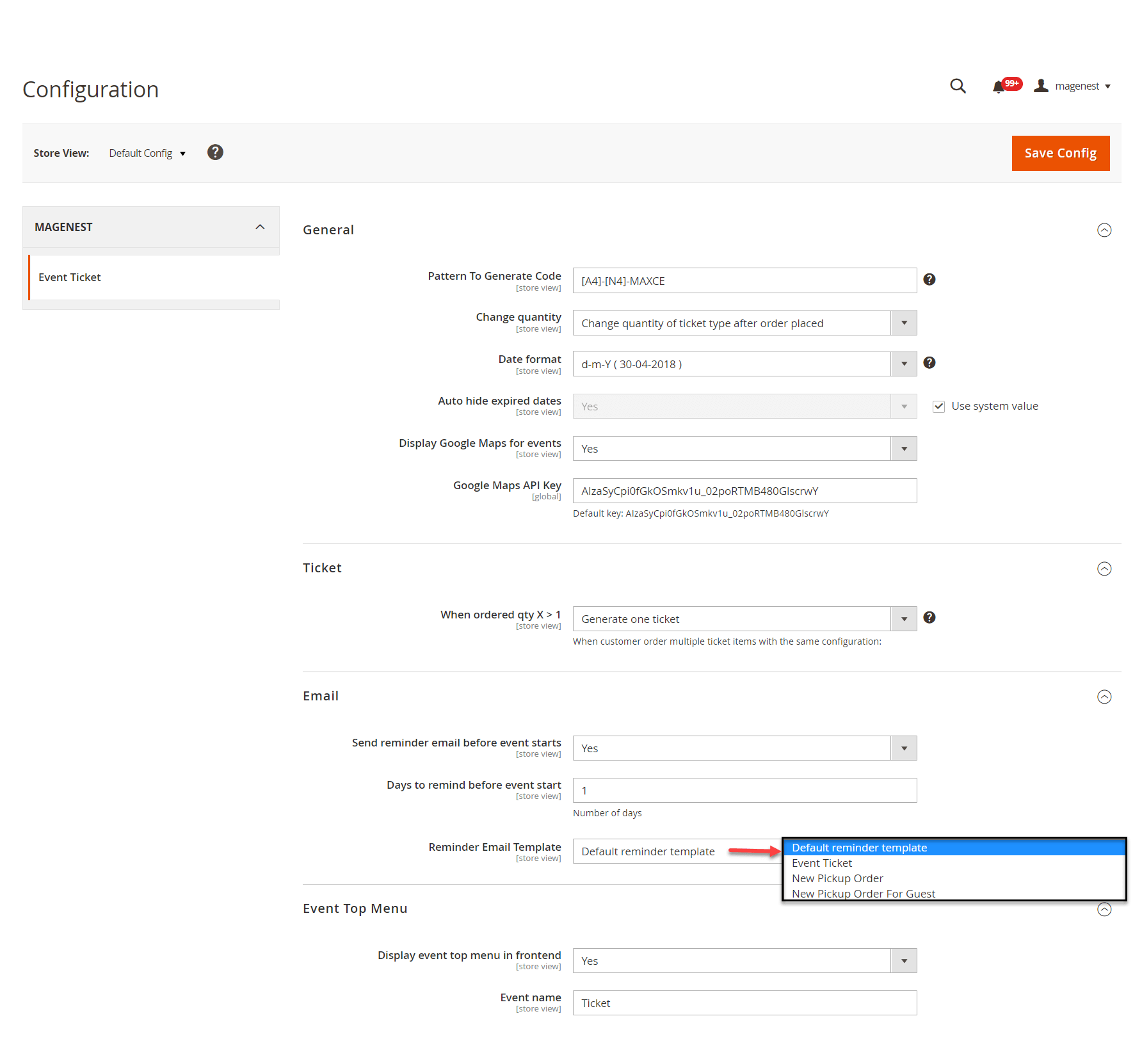 On the Admin sidebar, go to Stores > Configuration > Magenest > Event Ticket.