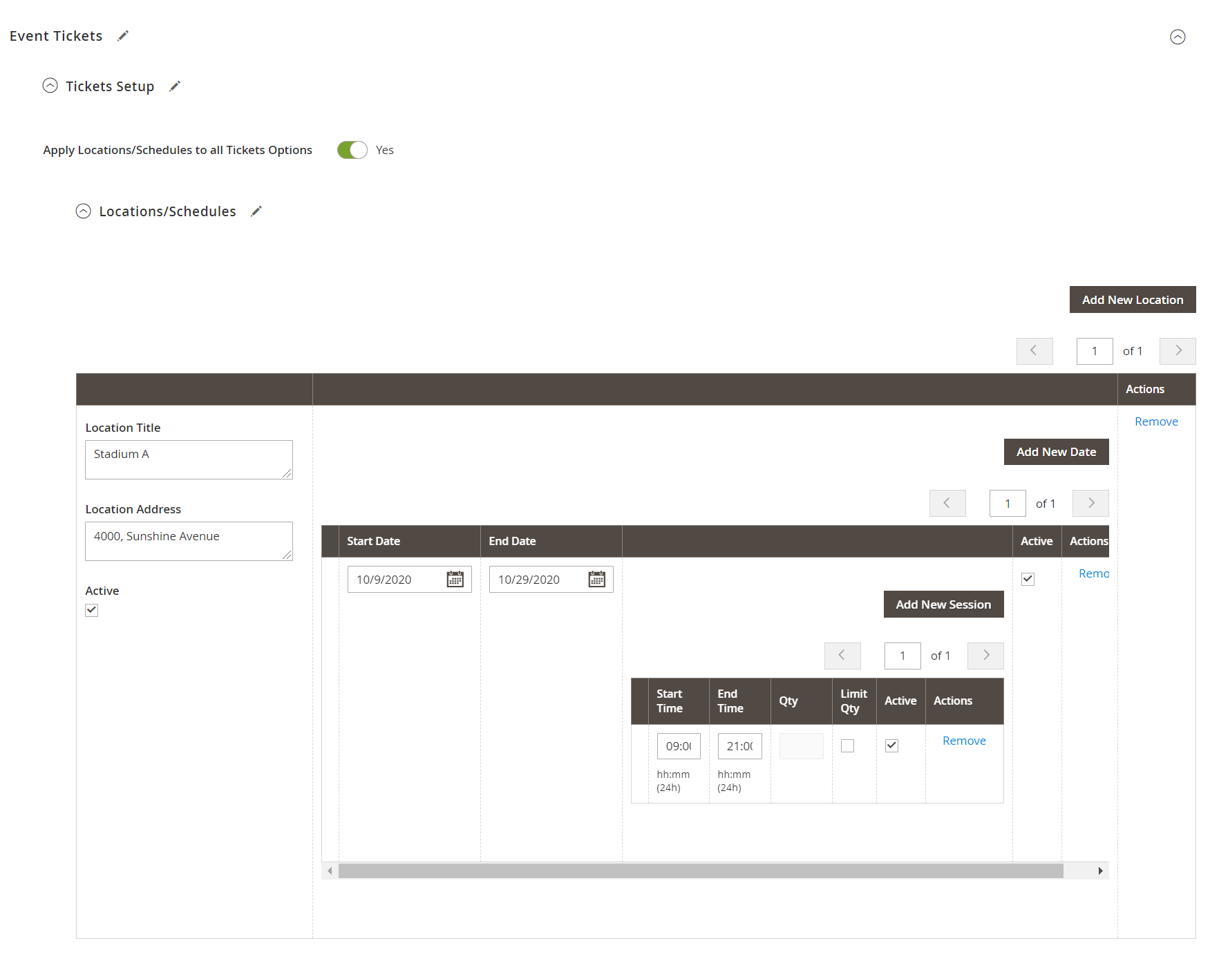 - Locations/Schedules: You can add multiple locations, with multiple dates and sessions/timeslot. You can set the limited quantity for each session.