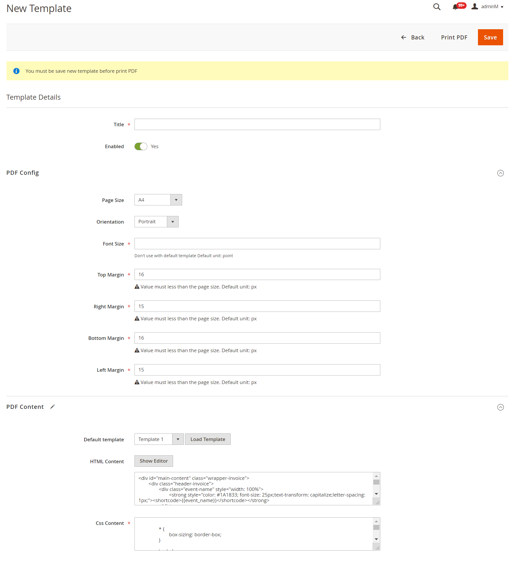 Note: To use this type of template you need to install the MPDF library for your store by running the command "composer require mpdf/mpdf" in the root directory.