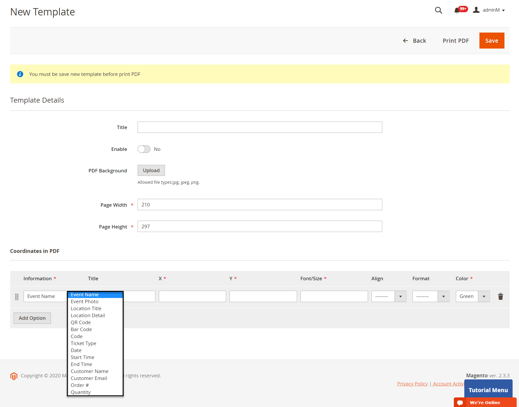 - Drag-drop pdf template design with XY coordinates in the admin panel