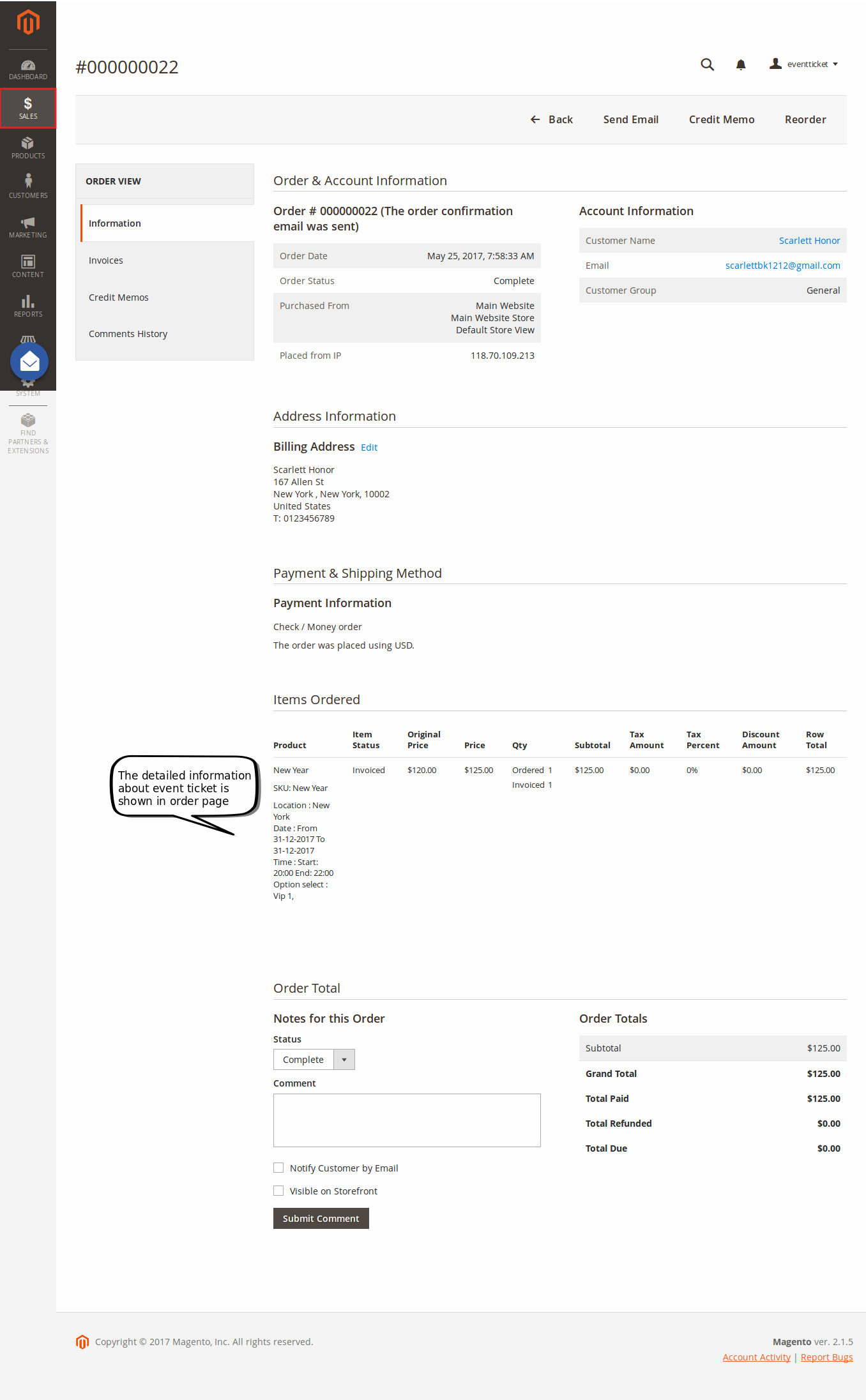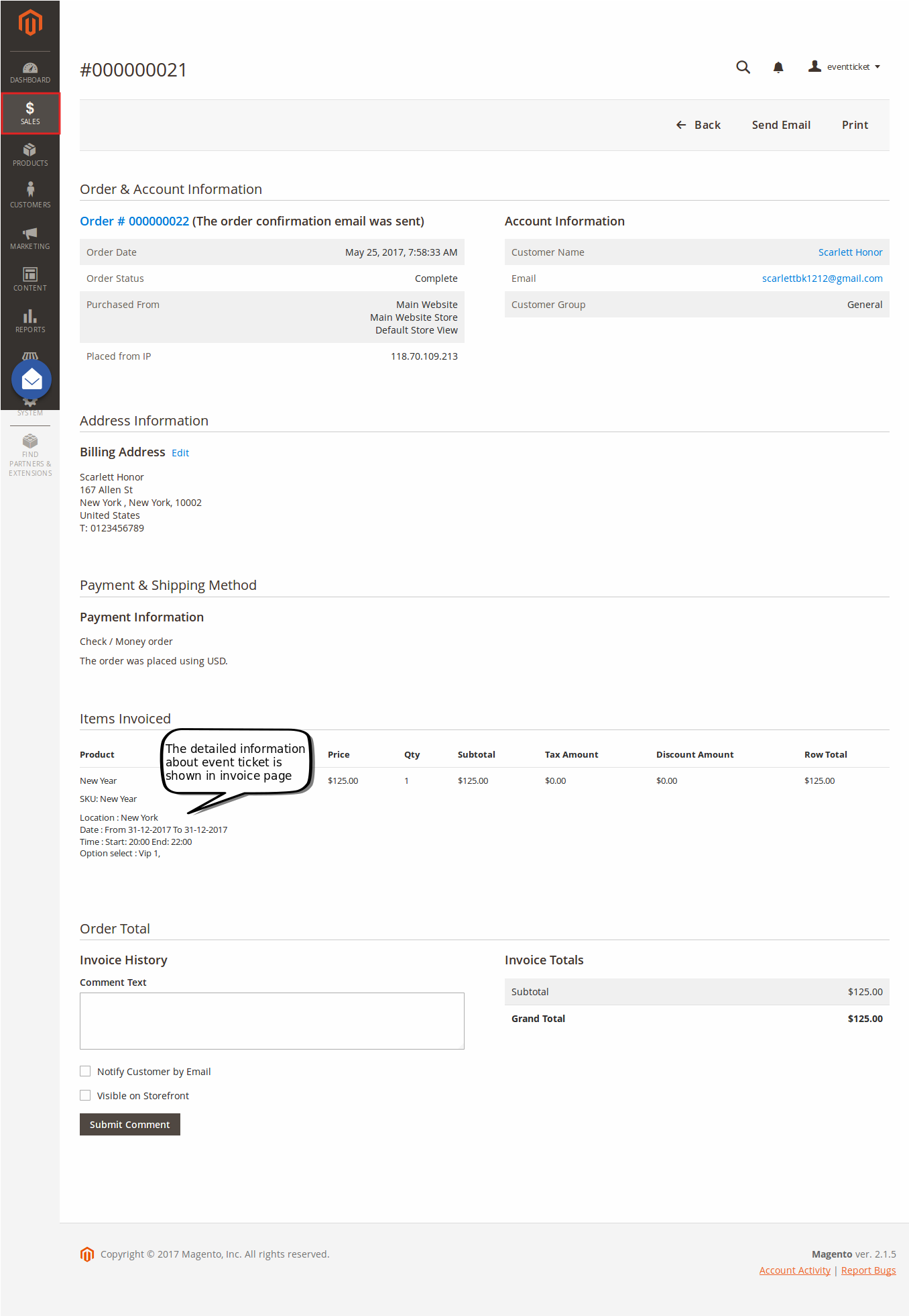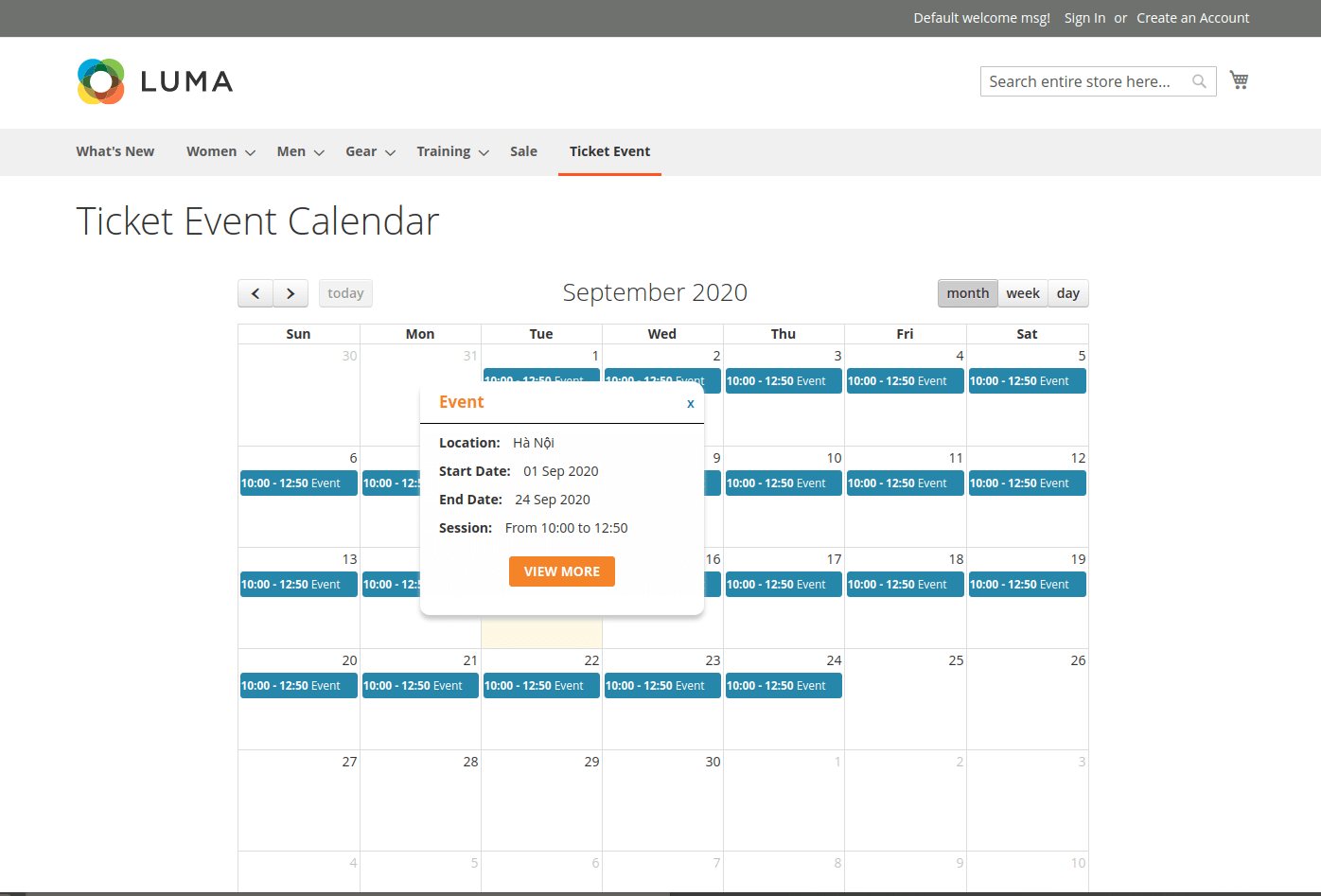 - After buying the event ticket successfully and the order is invoiced, in the My Account tab, click on My Ticket, customers can view ticket price, status, duration, and location as well as print PDF Ticket.