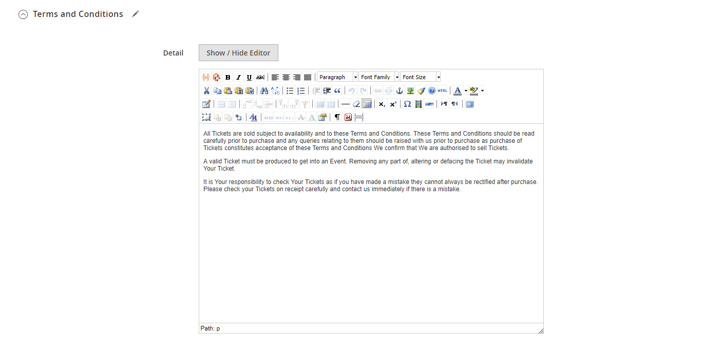 Catalog > Events > Edit > Event Tickets > Terms and conditions