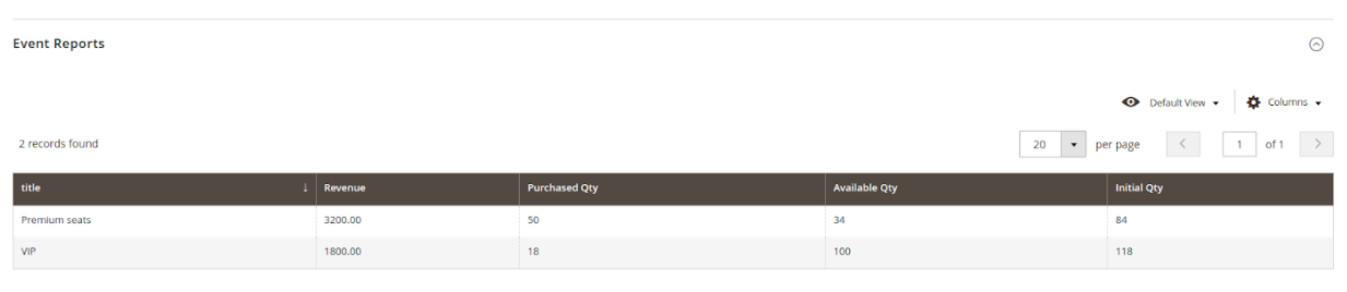 This grid table will show the sales statistics for each ticket option. You can see the available number of tickets, the purchased quantity, and the revenue from each option.