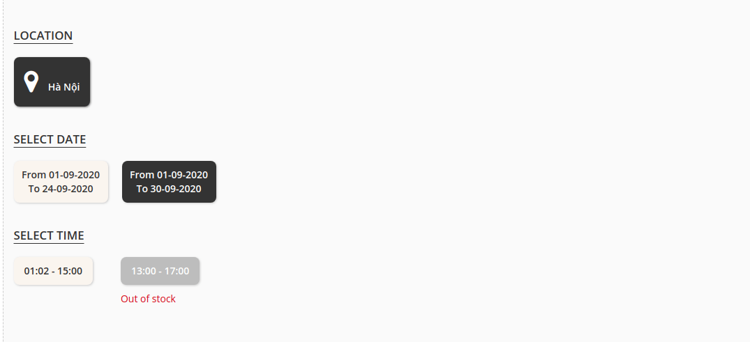 - Customers can choose the event location, date, and time. They can also choose the ticket option and view the event location with the pinpoint on Google Map right on the product page.