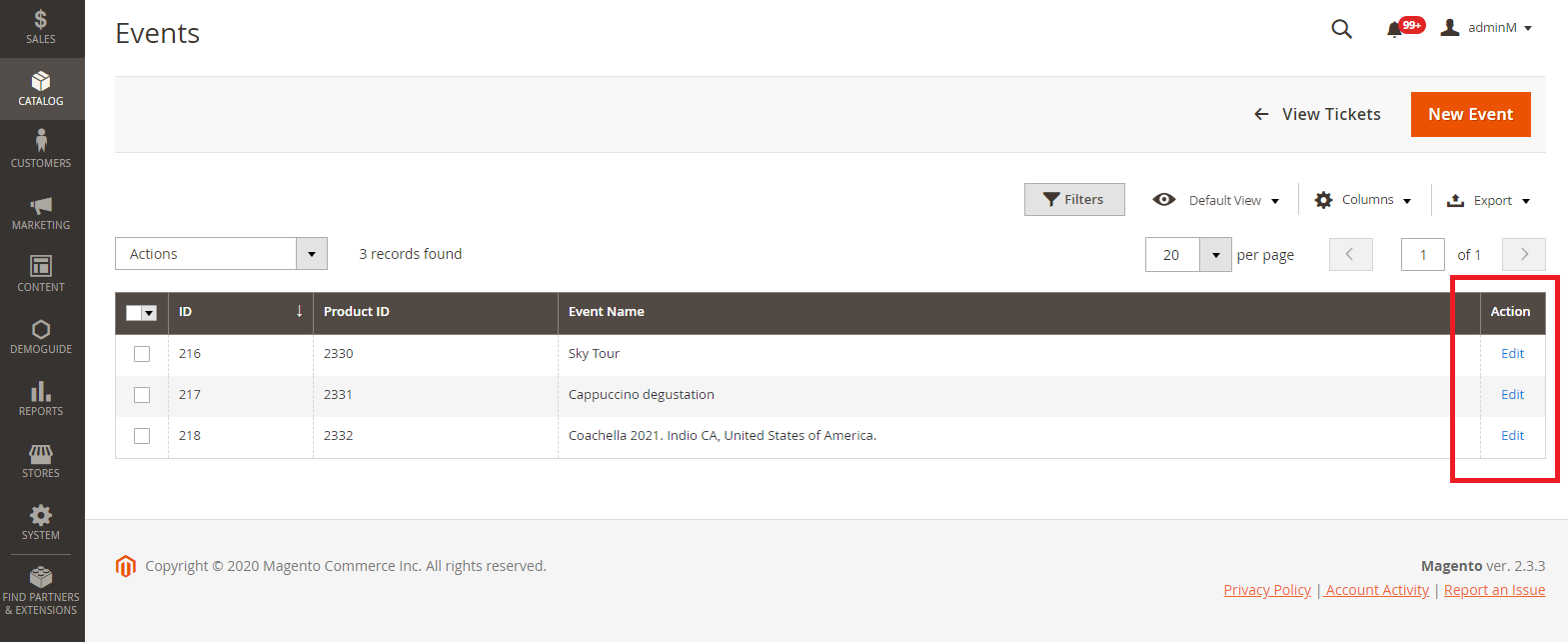 In order to create a new event ticket, go to Catalog > Events > New Event