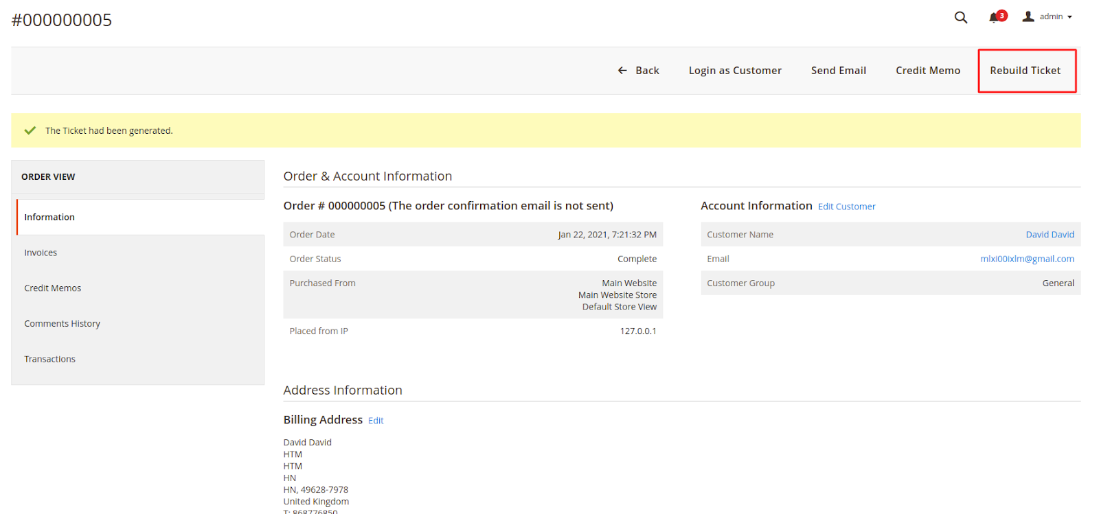 Note: The Rebuild Ticket functionality only working for the order invoiced.