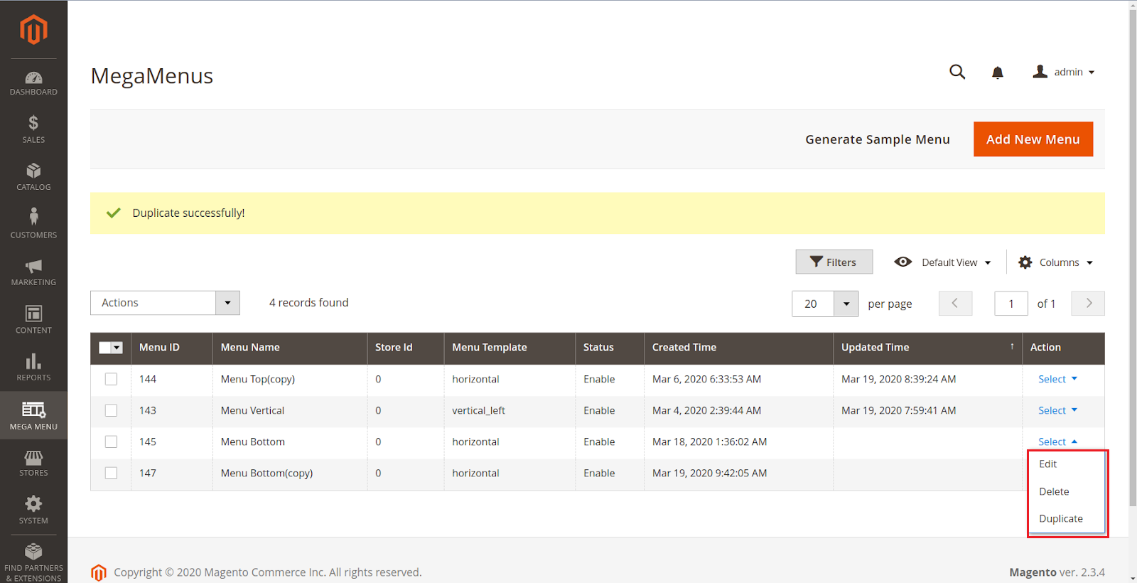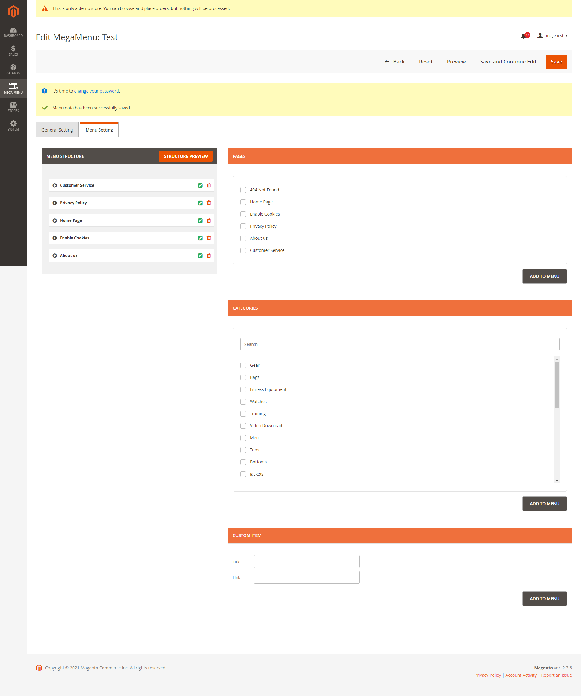 In Magento 2 backend > Mega Menu > Menus