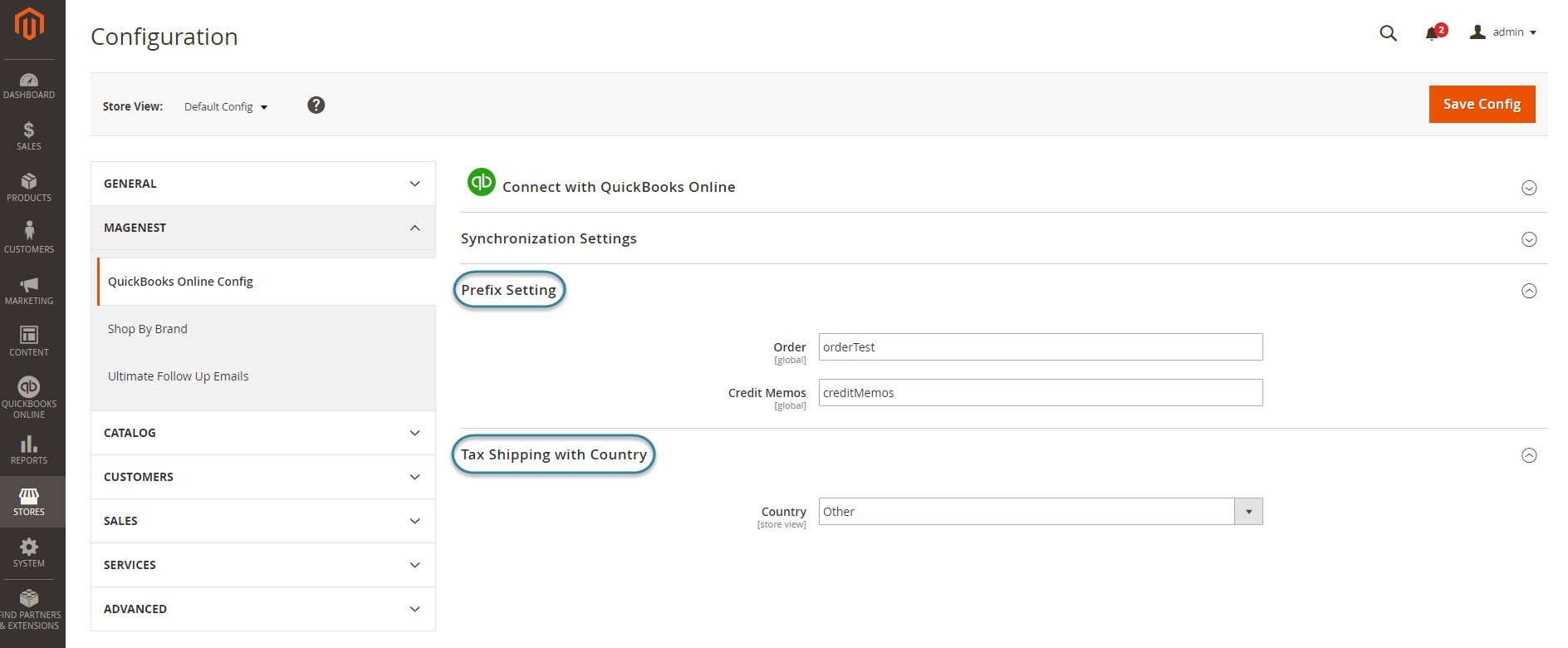 Finally, admins go to Prefix Settings and Tax and Country Settings section and expand them. Prefix Settings: In order to make sure that the synchronization process works correctly, admin should set a prefix for Invoice and Credit Memo, to differentiate between transactions synced from Magento and created on QBO. On QBO Company Settings -> Sales -> Use Custom Transaction number should be OFF.