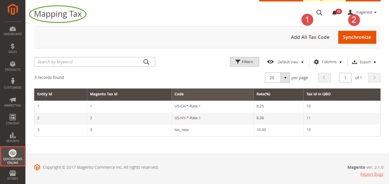 The system has created a Mapping Tax tab that allows you to mapping tax from your Magento 2 store to QuickBooks Online account. First, admins need to click on Add All Tax Code button to add all tax code of your Magento 2 store to Mapping Tax page. Then, you can use Synchronize button to finish this mapping.