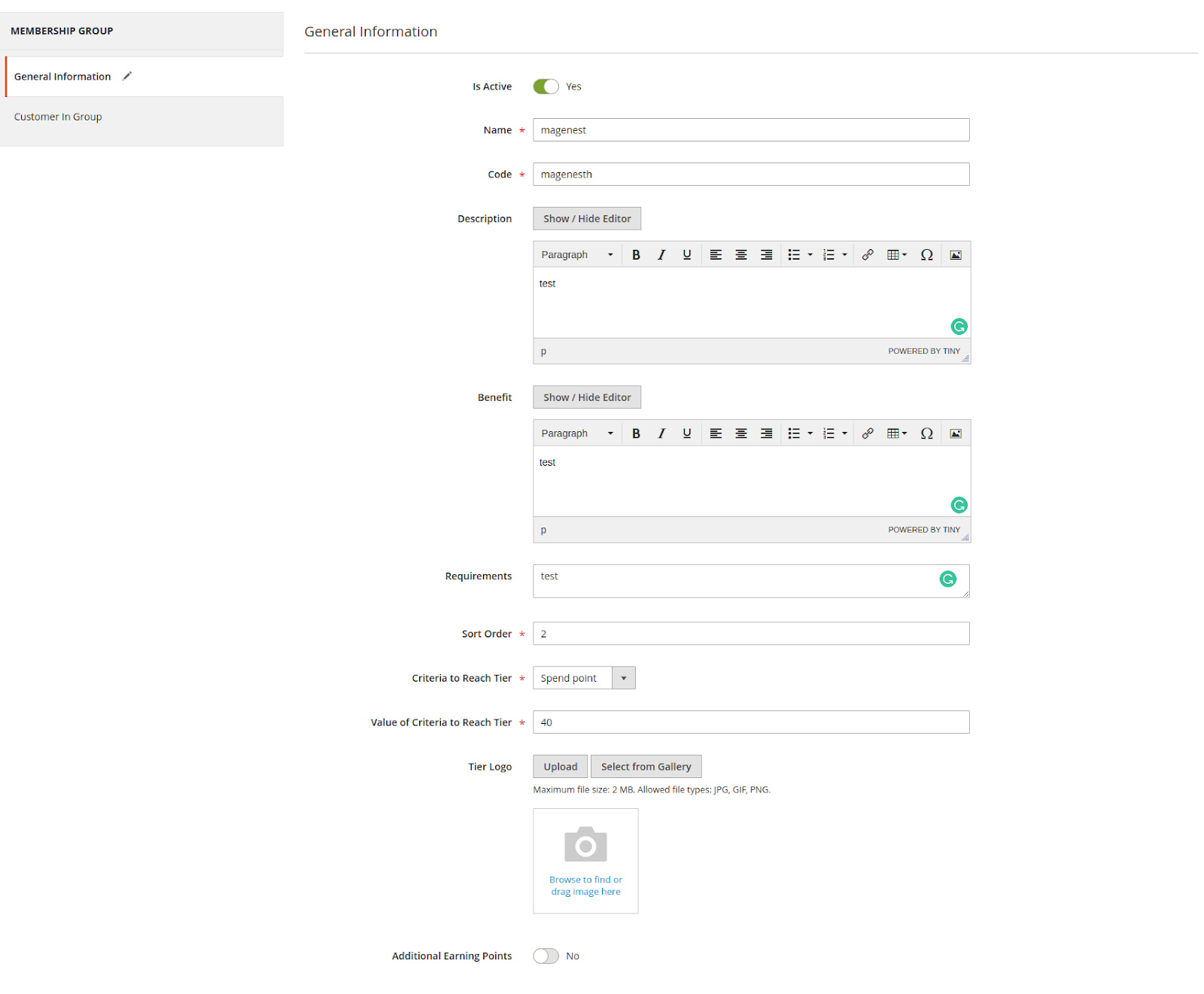 - Is Active: Choose Yes to enable Membership Group.
