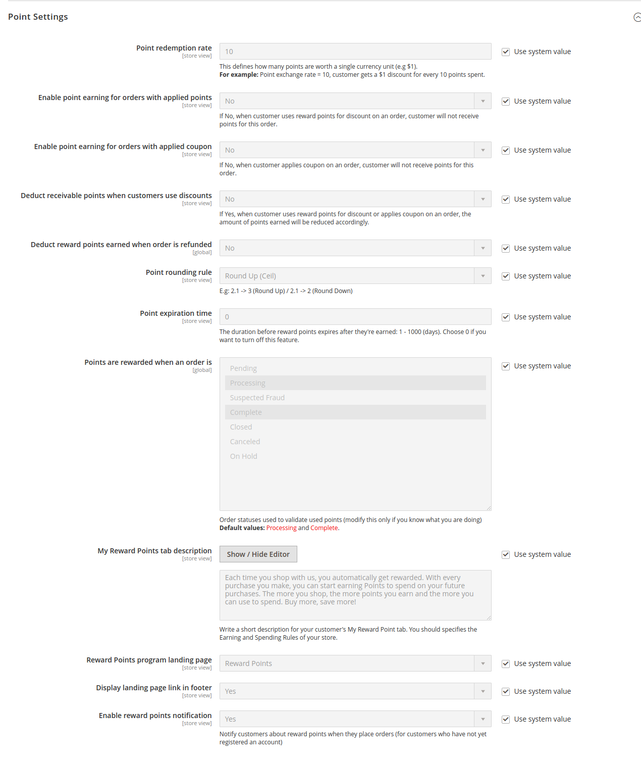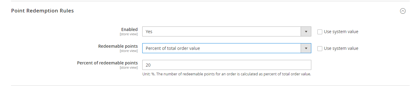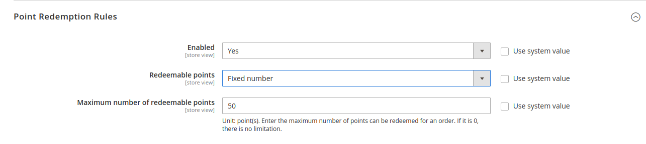 Point redemption rate: This defines how many points are worth a single currency unit (e.g $1). For example: Point redemption rate = 10, the customer gets a $1 discount for every 10 points spent.