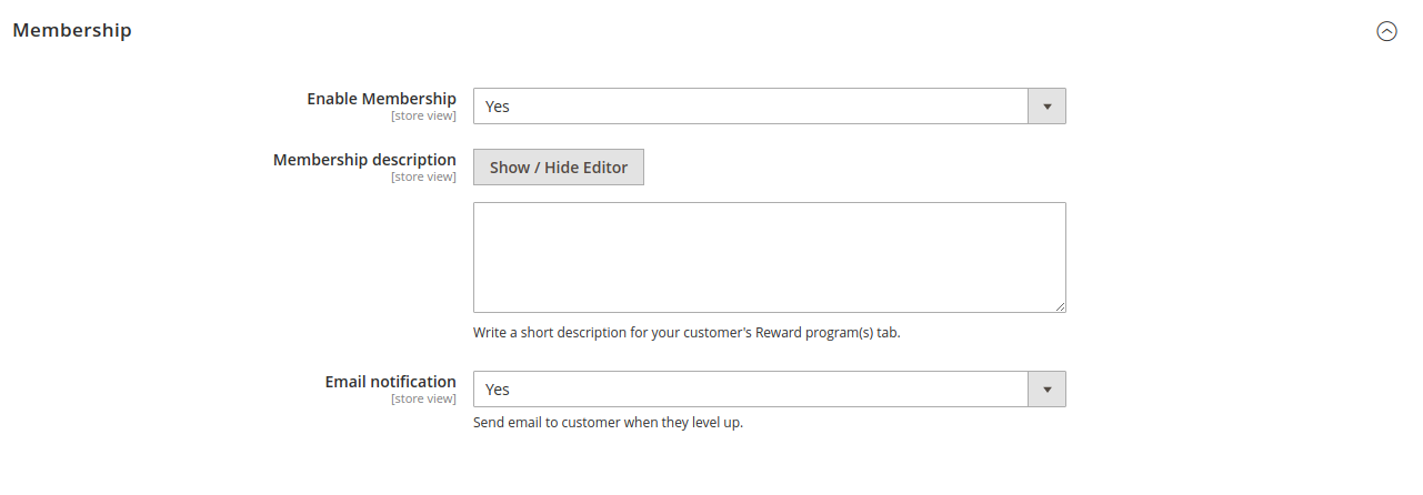 After the add-on is enabled (in the Reward Points Configuration), you can set up the add-on in Marketing > Reward Points > Membership.