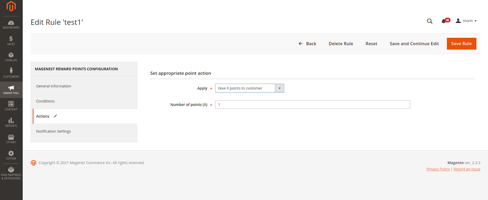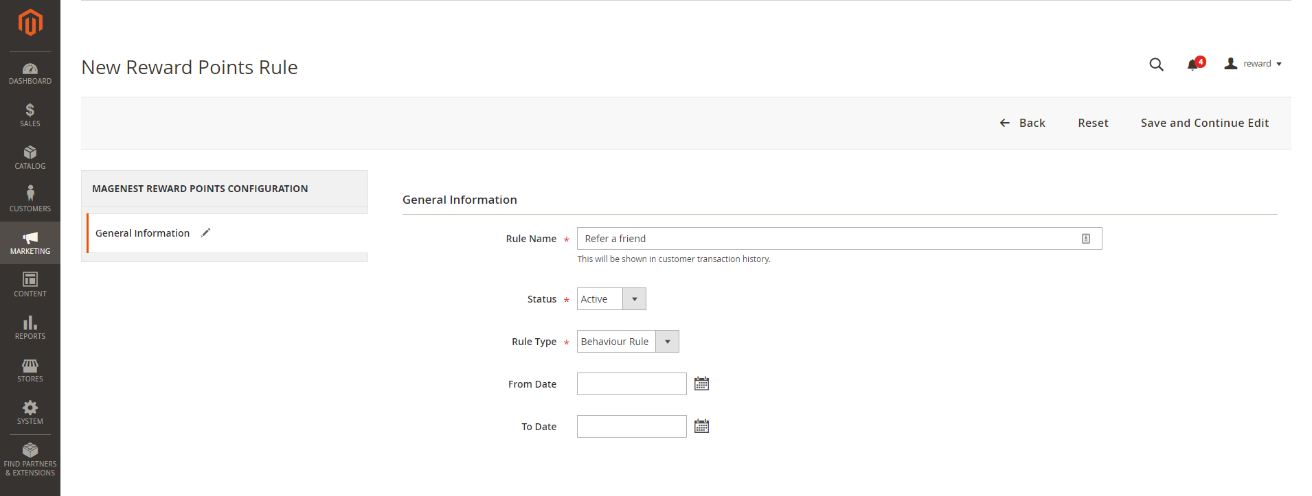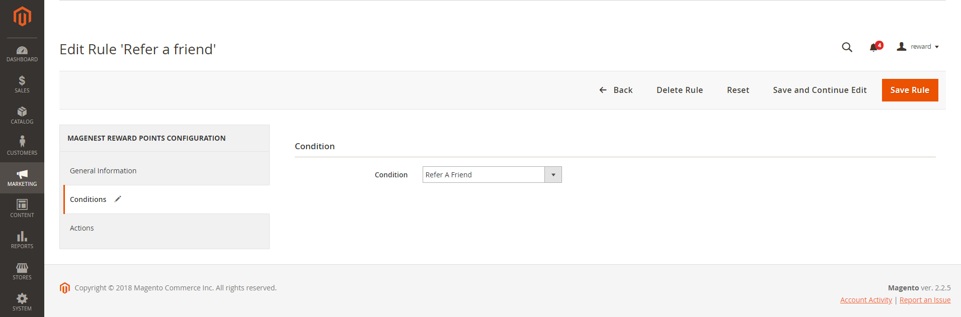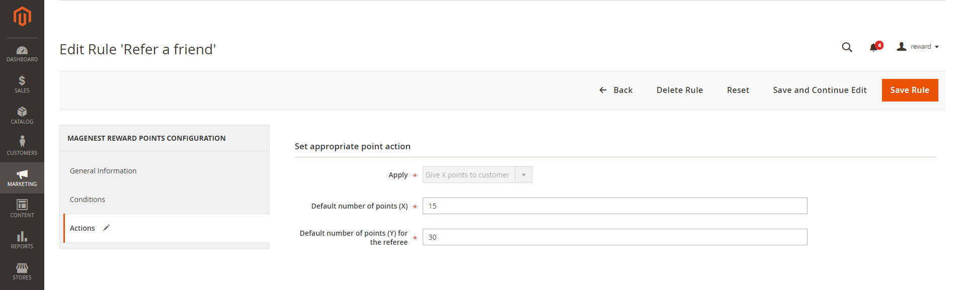 After enabling the referral code function, go to Marketing > Reward Points > Rules and create a behavior rule - Refer a friend.