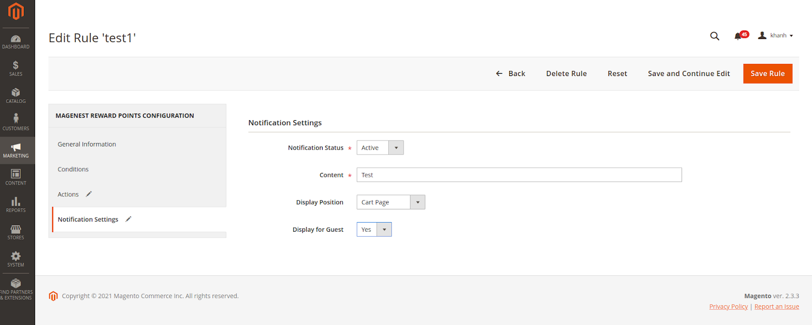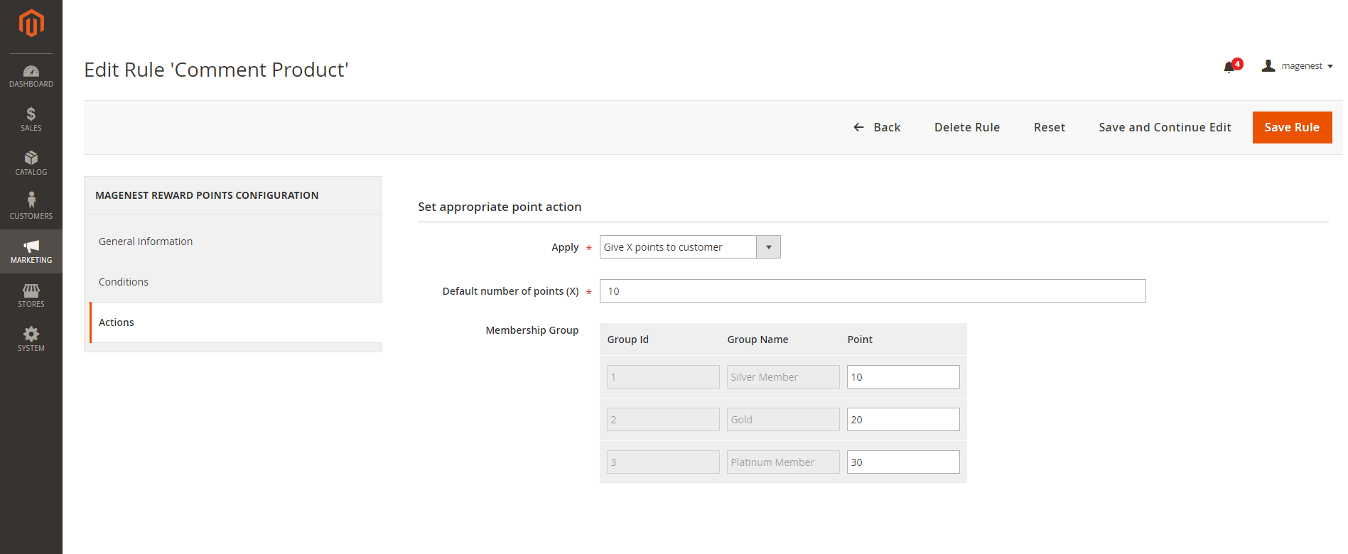 In Magento 2 back end, go to Stores > Configuration > Magenest > Reward Points.
