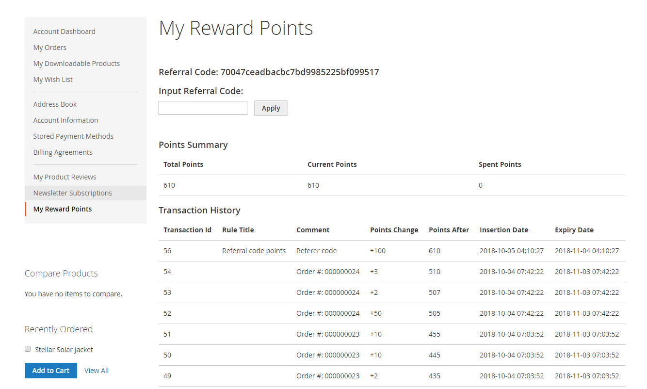 On My Account Page, customers can track the reward points usage as well as the transaction history.