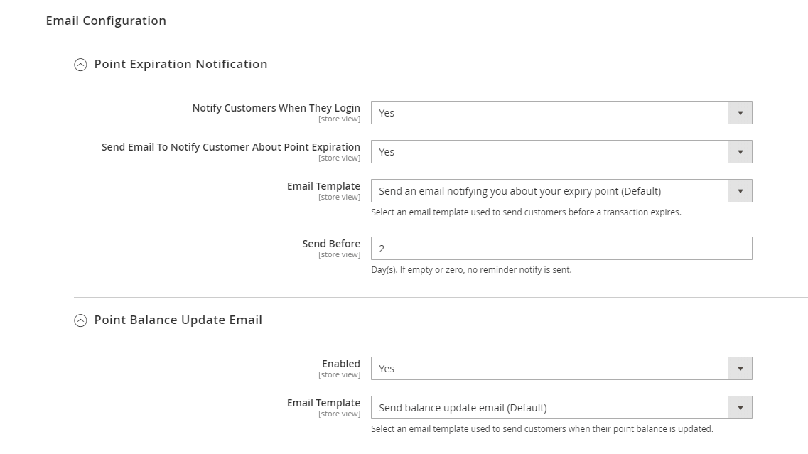 - Send Email To Notify Customer About Point Expiration: Choose Yes to send reminder emails to the customer about the upcoming expired reward points.