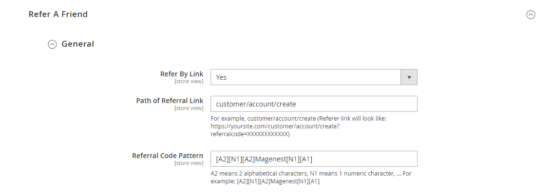 - Referral code patterns: The referral code format. [A5] means to generate 5 random alphabetical characters, [N4 ] will generate 4 random numbers. "Magenest" is the hard code