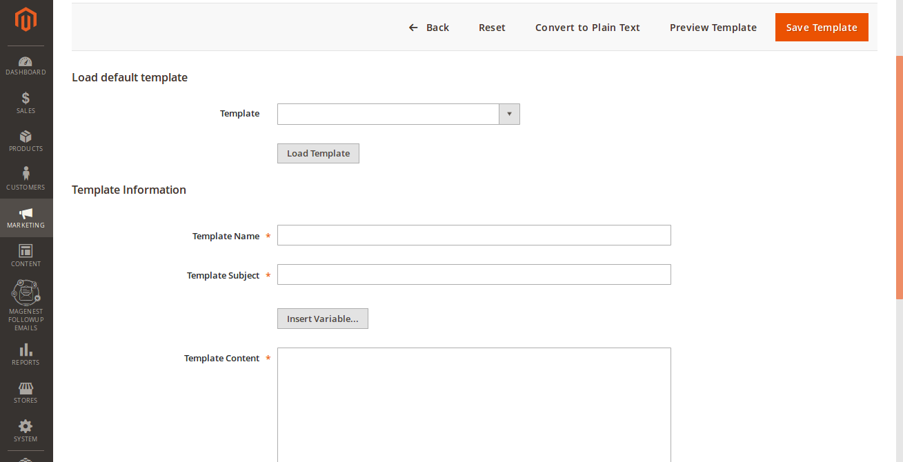 - On New Template page, choose the default template, then set the Template Information section with Template Name, Template Subject, Template Content, Template Styles. Template Name, Template Subject and Template Content fields will be taken from the template and processed with the filter. The Sender Name and Sender Email fields are ignored by the extension, it uses the values specified in the Configuration (Gmail Account).