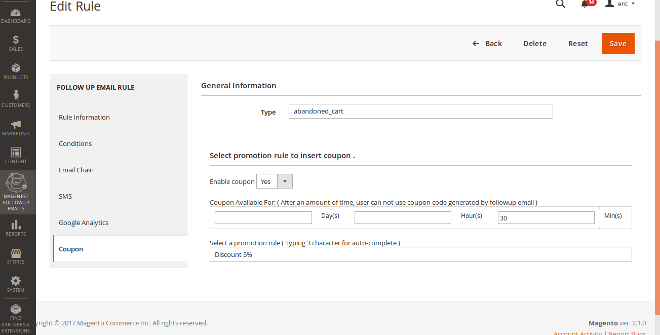 Select a promotion rule: choose a promotion rule. Then choose the coupon you want to send to customer with the follow-up email.