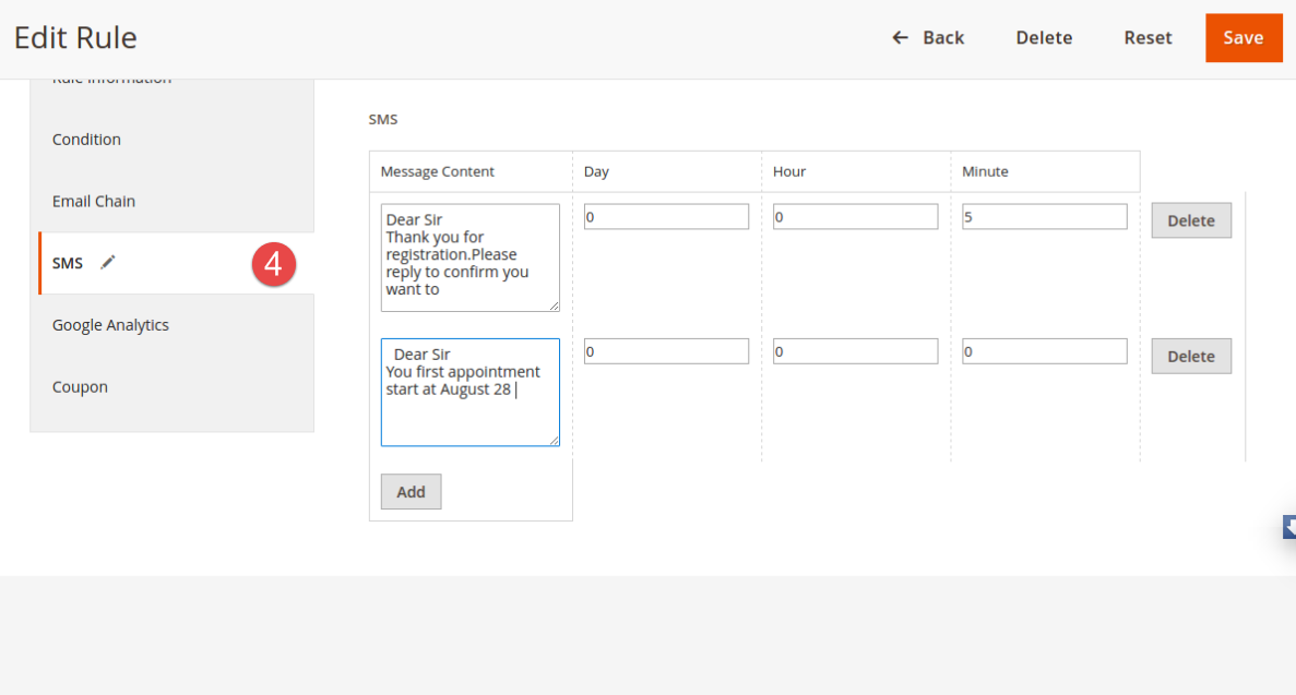 Note: You can add more than one SMS for a rule to send customers.