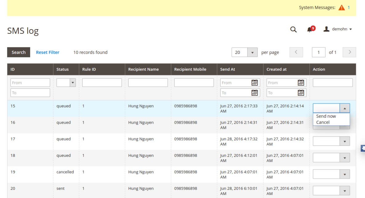 In the Sms log screen, you can view and manage all of things related sms, including: ID, status( queued, sent, failed, cancelled), Rule ID, Recipient Name, Recipient Mobile, Send At and Created At.