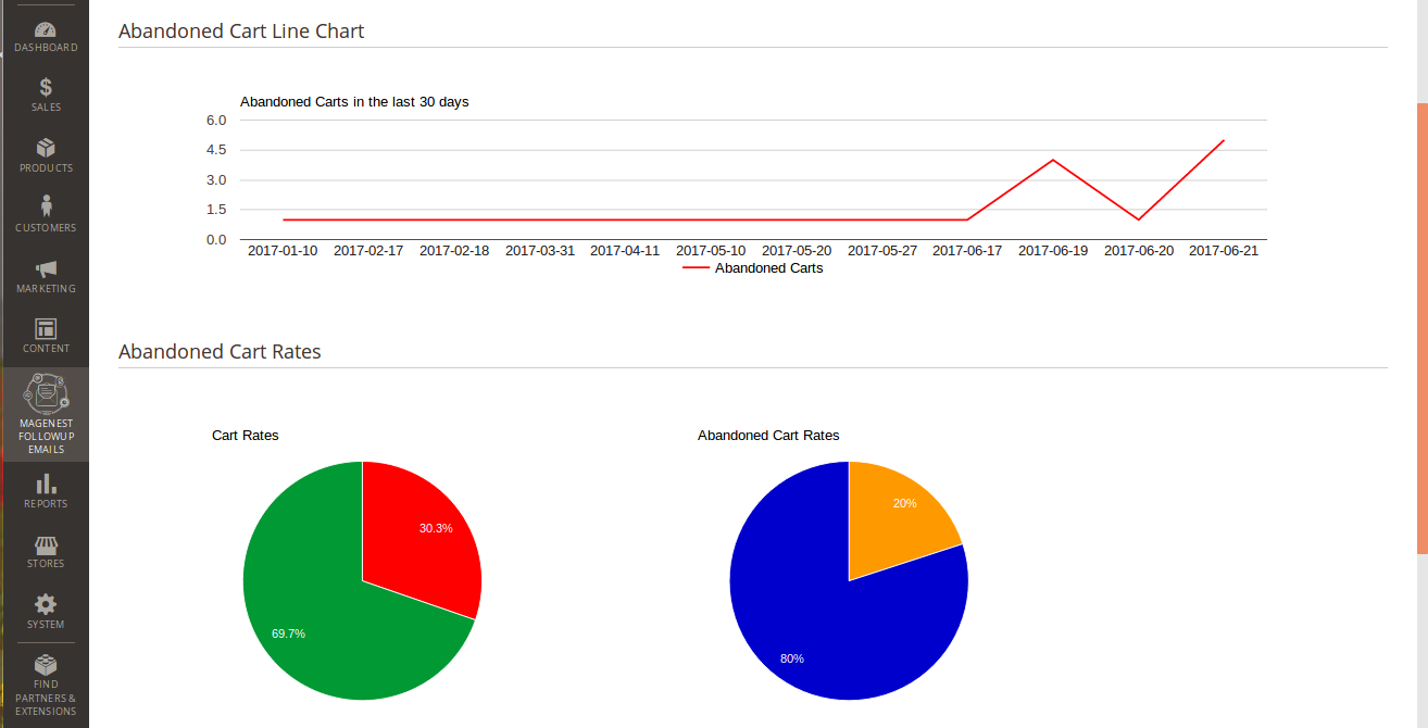 This section is divided into 2 parts: Abandoned Cart Line Chart and Abandoned Cart Rates which are really helpful for catching the behavior of customers by statistics.