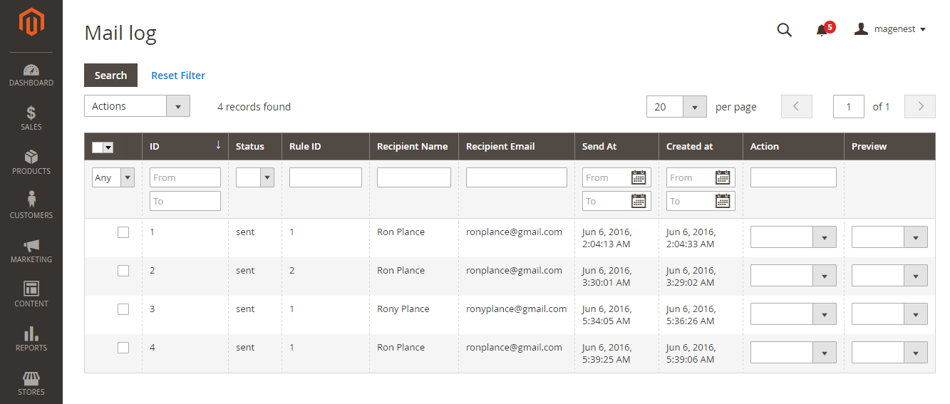 In the mail log grid, you can view any of the currently scheduled, already sent, failed and cancelled emails. The grid shows the status, created at/ sent at time stamps, rule details (rule ID, rule name) and recipient details email address).