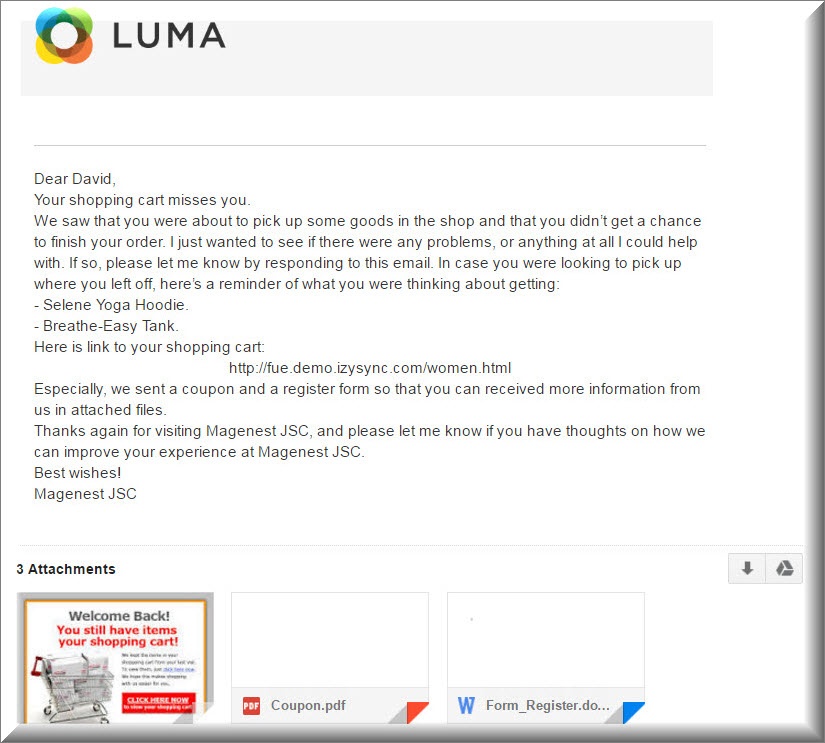 The following is an abandoned cart email that they received when customers added items into their cart but they did not check out.