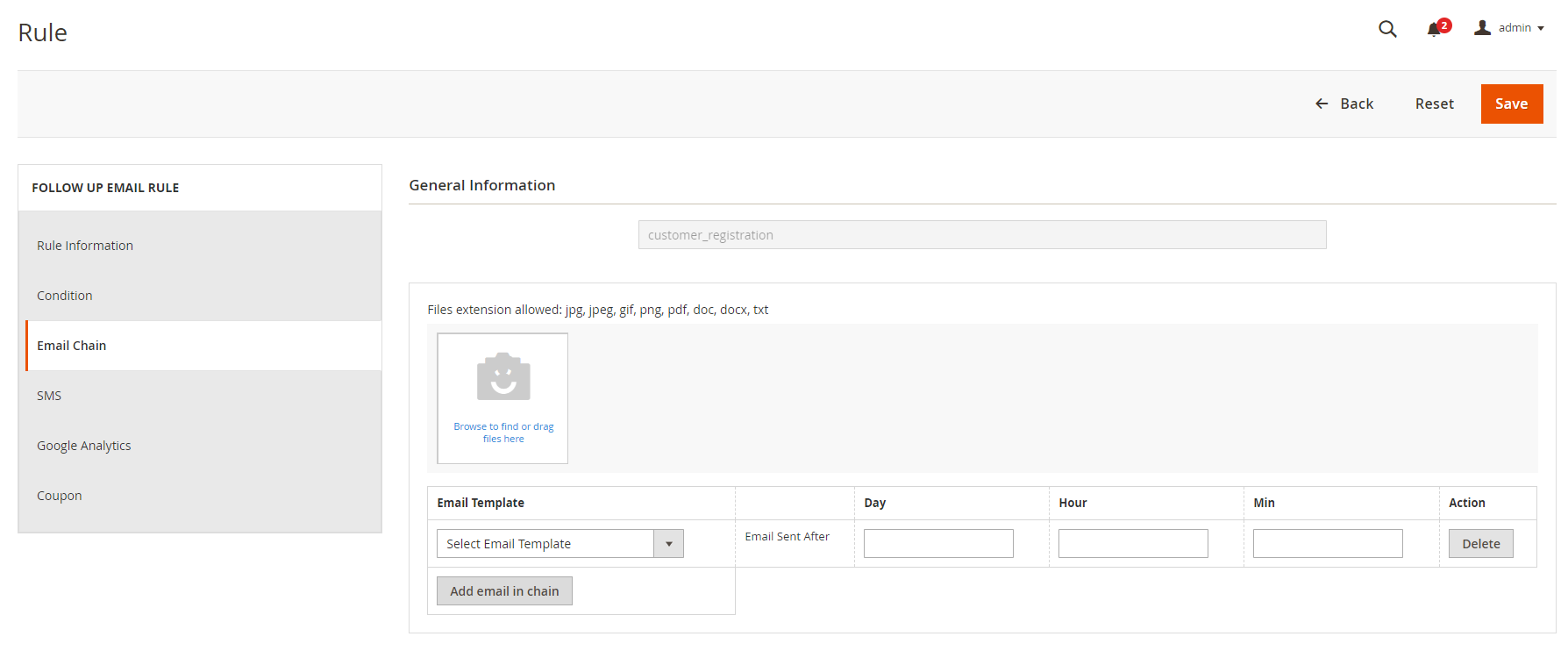 In this section, you can add email templates sent to the customer when the rule gets triggered for each period. It requires at least 1 email for a rule.
