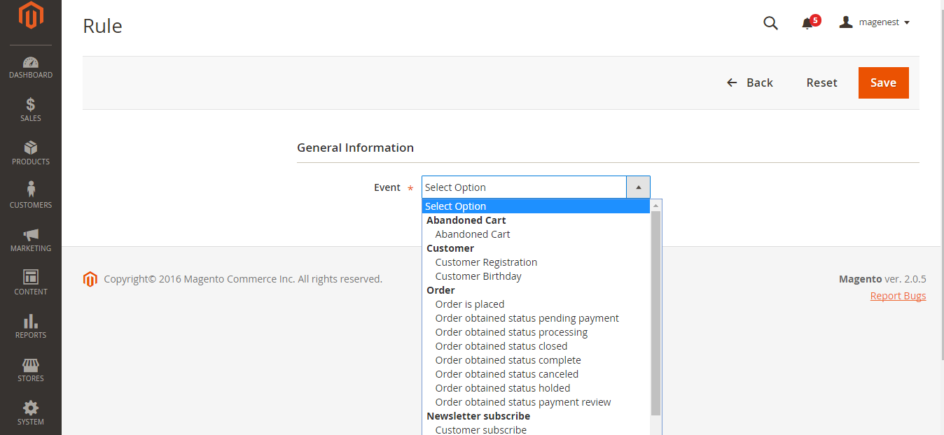 At Magento 2 back end, we created many available events such as Abandoned Cart, Customer Birthday, Customer Registration, Order Is Placed, Order Obtained Status Pending Payment and more in Ultimate Follow Up Email extension. You only choose events that they want to create and set them by entering some fields such as the content email, the content SMS, time to send emails/SMS and so on. Then, they will automatically send to customers. This is really useful and convenient for the business because the owner store can easily control contents sent and choose the best time to send your email marketing campaigns.